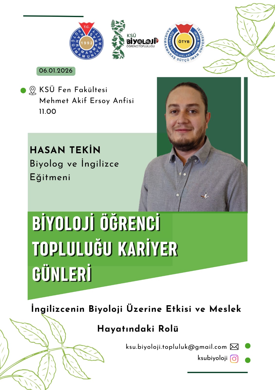 KSÜ Biyoloji Öğrenci Topluluğu tarafından düzenlenen Kariyer Günleri kapsamında, biyolog ve İngilizce eğitmeni Hasan Tekin bizlerle buluşuyor.